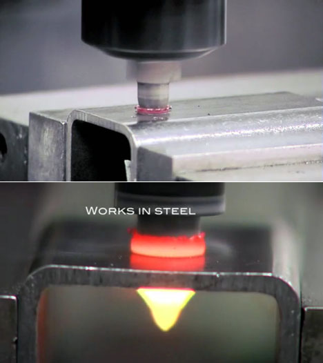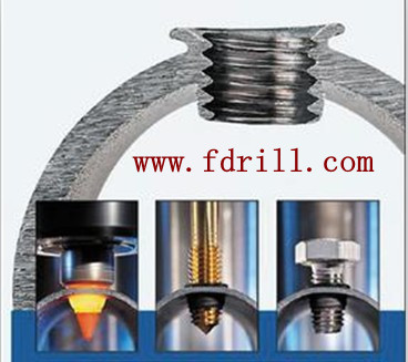 作為替代方案,高溫無屑鉆孔的熱熔鉆技術,它不僅降低了成本,而且還提高了質量。這項技術的原理如下:一個耐高溫的硬質合金刀具在以通常是1000到4000轉/分鐘的轉速下,與工件擠壓摩擦生熱,使材料變軟成可塑性狀態,在幾秒鐘內將初始材料拉伸成原來長度三倍左右的襯套,可直接攻絲或焊接或做軸承支撐,能承受強大的螺紋連接。鎢鋼熱熔鉆技術可以用在幾乎所有的金屬材料如鋼鐵,不銹鋼和有色金屬(如銅,黃銅和鋁)。它的優點是刀具壽命很長,清潔、不產生切屑,并且孔精度很高,相比焊接螺母技術,單個孔的成本要低很多。