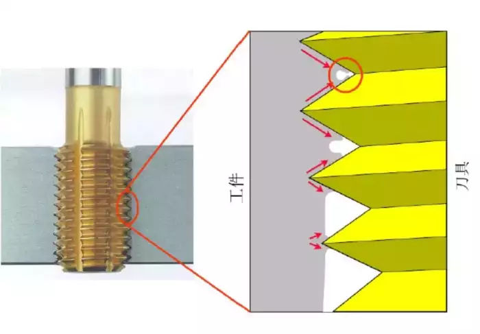 切削絲錐具有不完全螺紋牙行切削齒及容屑槽,切削齒逐步切入,切屑由容屑槽排出。