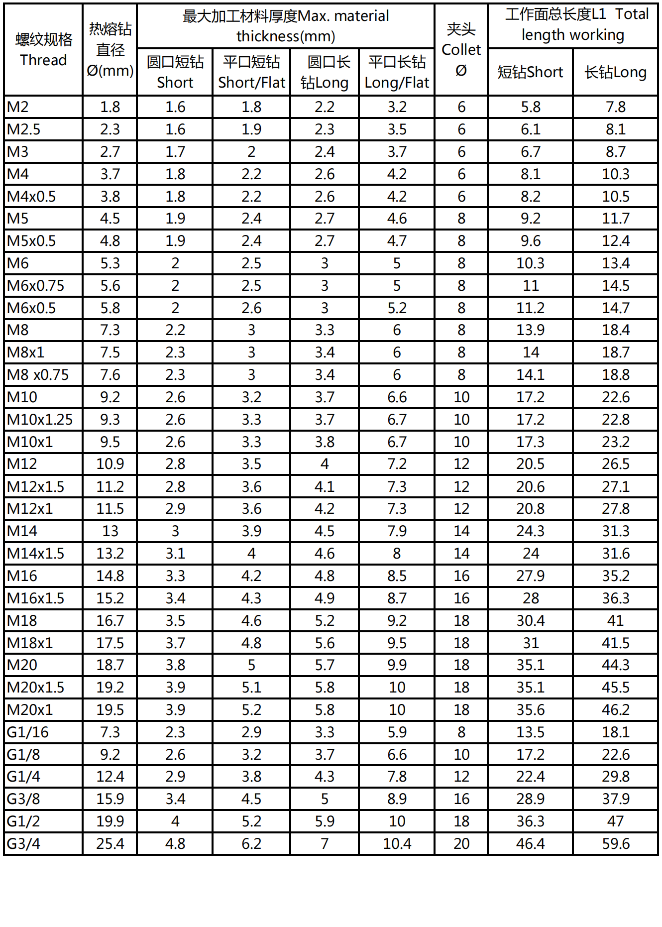 熱熔鉆的規格: 標準Fdrill熱熔鉆頭的直徑自2.0毫米至25.4毫米。 Fdrill熱熔鉆的規格尺寸大小一般是根據螺紋規格來區分,常用規格包括: 公制粗牙/細牙(M):M3,M4,M5,M6,M8,M10,M12,M14,M16,M18,M20; 英制直管螺紋(BSP):G1/8,G1/4,G3/8,G1/2,G3/4; 美制粗牙/細牙(UNC/UNF):No.4,No.5,No.6,No.8,No.10,No.12,1/4,5/16,3/8,7/16,1/2,9/16,5/8,3/4; 美制錐管螺紋(NPT):1/8'',1/4'',3/8'',1/2'',3/4''. 特殊規格的Fdrill熱熔鉆頭可以根據用戶的需要訂制。我們的技術支持團隊將根據用戶的加工要求設計并生產特殊規格的的Fdrill熱熔鉆頭;同時也會應用戶的的要求,幫助進行測試及分析。