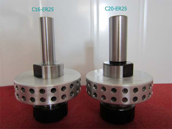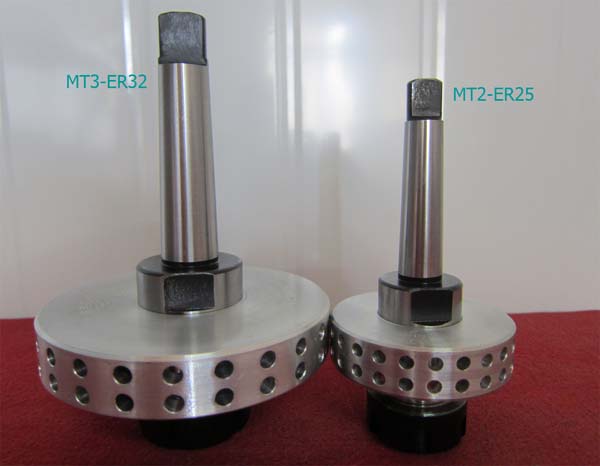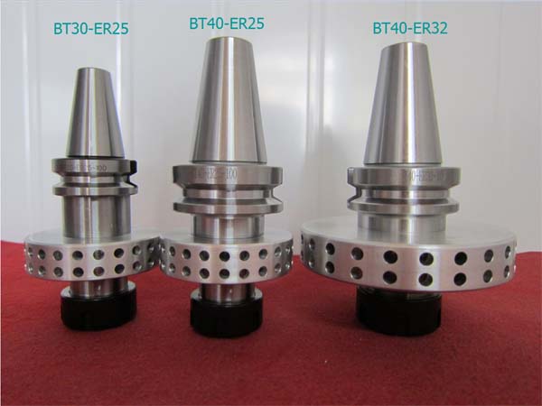 專用散熱翼刀柄不僅可以夾緊熱熔鉆頭,保證熱熔鉆頭高速旋轉的同心度,而且擁有其他的重要功能:特殊材質的鋁合金散熱圓盤開有很多小孔,將產生的熱量快速的散發掉,可以降低由鉆孔所產生的高溫(連續工作時溫度達到600-800度),保證鉆床主軸不會因過高的溫度而損壞。 我們可提高以下規格的散熱刀柄配合鉆床設備使用:1.手動鉆床:可提供MT2(莫氏2#錐度)和MT3(莫氏3#錐度)兩種莫氏錐度,和Ø16、Ø20mm圓柱型散熱刀柄。 2.CNC 加工中心: 可提供BT30,BT40, HSK A-63, ISO30, ISO40, SK40和CAT40等類型的散熱刀柄