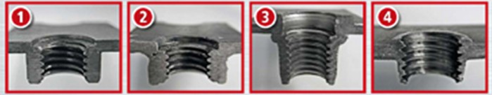 Fdrill熱熔鉆解決了這些固有問題,可以有效地在薄板或方管、圓管上鉆孔攻絲,改善了孔的精度、降低生產成本、節省大量準備和裝配時間。 下面是生產一個M8螺牙(2.0mm中碳鋼),使用傳統工藝 vs Fdrill熱熔鉆。