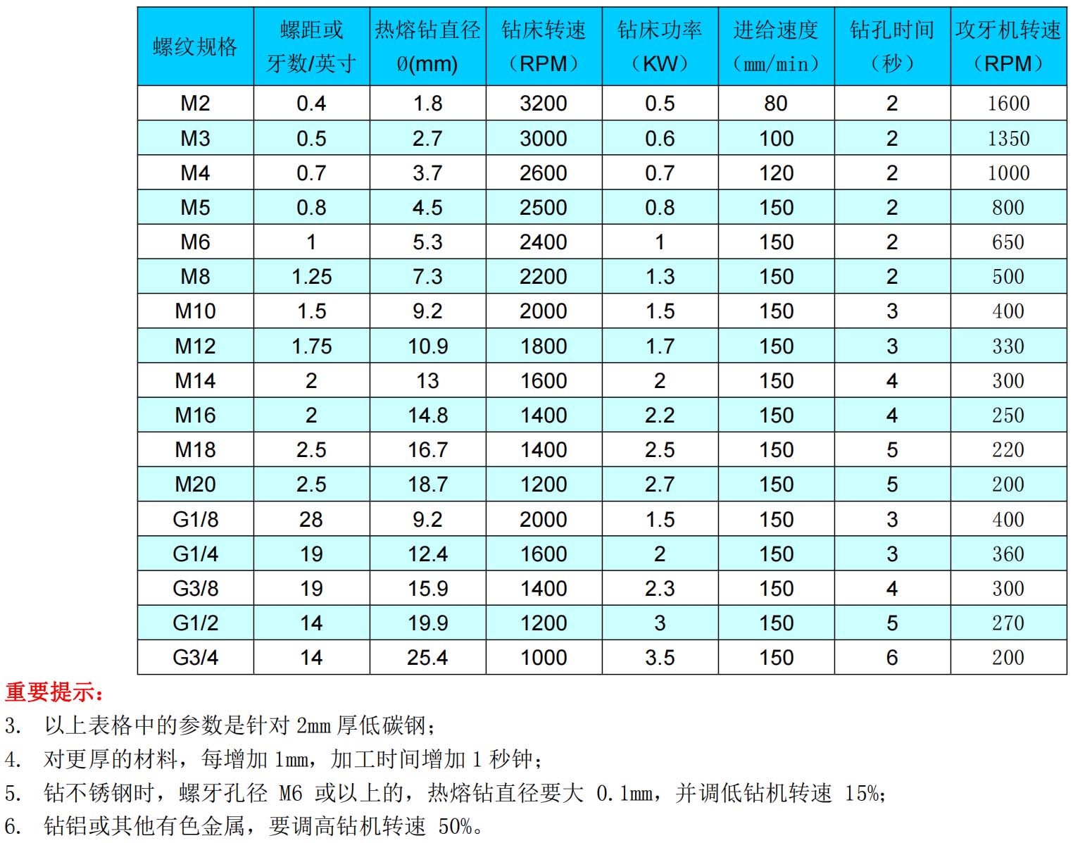 熱熔鉆加工不同材料的功率和轉(zhuǎn)速選擇表