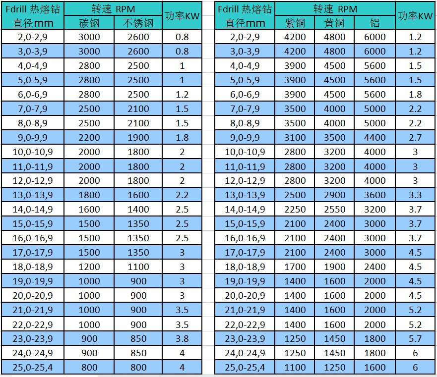 熱熔鉆加工不同材料的功率和轉速選擇表