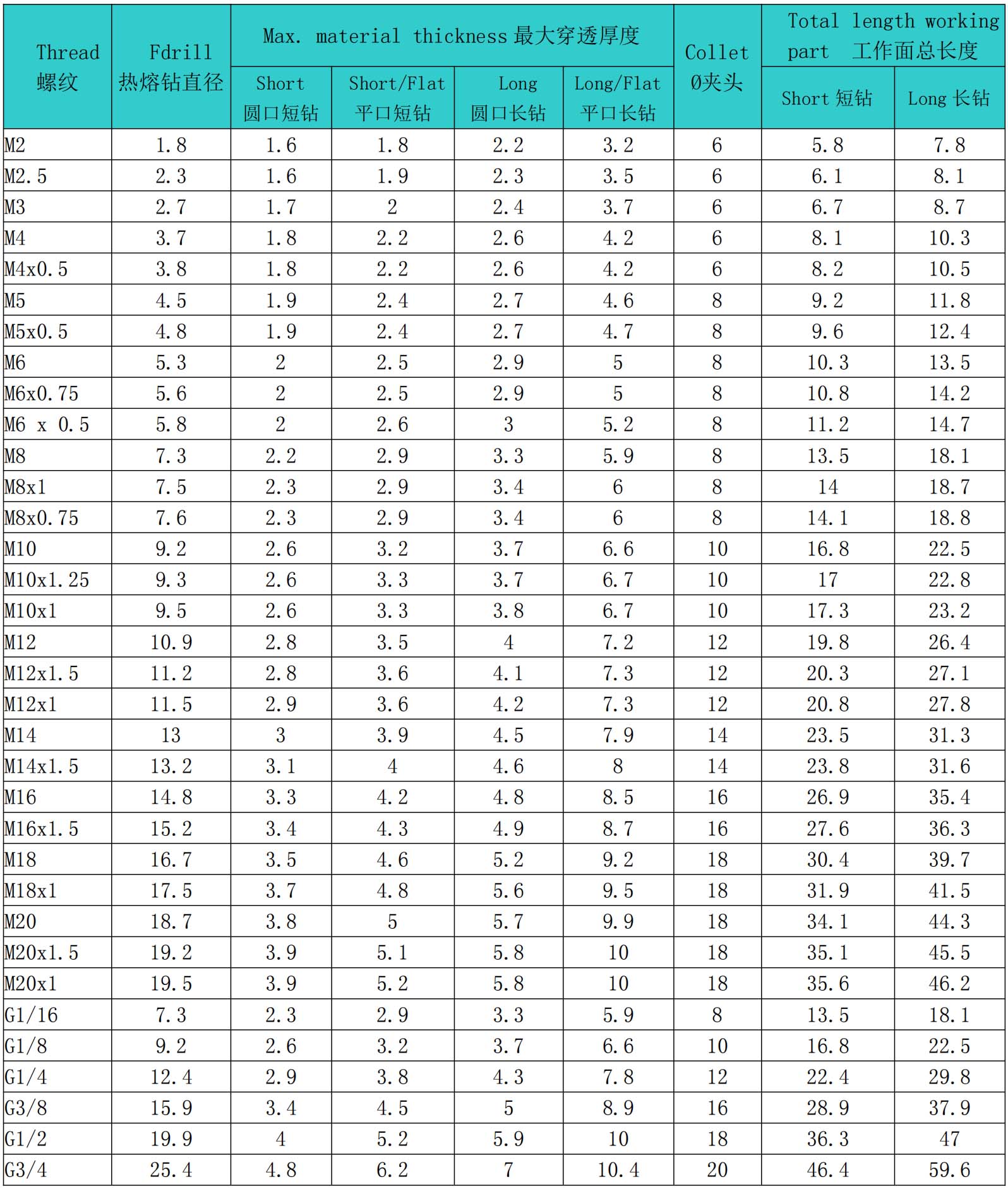 材料厚度(Material thickness):最大材料厚度(hmax.)與Fdrill熱熔鉆直徑成正比,此時需要較高功率。最小材料厚度的一般規則:hmin ≈ 0.2*d至2mm(其中d是Fdrill熱熔鉆的直徑),此時需要較高轉速。如果用于很厚或硬度很高的材料,Fdrill熱熔鉆的壽命將縮短。注:以下表格參數是指常規熱熔鉆頭。如果客戶所加工的材料厚度很薄或很厚或孔徑很小,株洲熱鉆公司可根據客戶要求定制特殊形狀和長度的熱熔鉆頭。